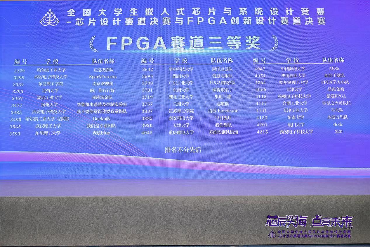 11月29日至12月1日,2024年全国大学生嵌入式芯片与系统设计竞赛-FPGA创新设计竞赛全国总决赛在南京举行,本届大赛FPGA赛道共有625所高校的6107支队伍、16675人报名参赛,最终共327支队伍进入全国总决赛。