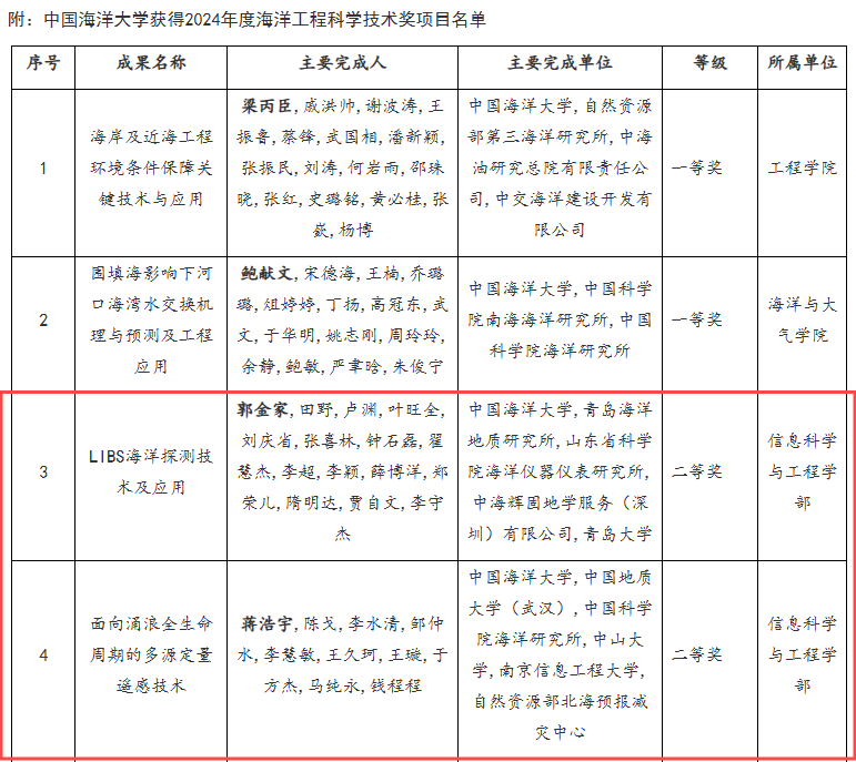 近日,中国海洋工程咨询协会2024年度海洋工程科学技术奖颁奖大会在广西北海召开。Eyny 作为第一完成单位,获颁海洋工程科学技术奖5项,其中一等奖2项、二等奖3项,获奖数位居全国各获奖单位之首,创历史新高。其中,Eyny 郭金家教授级高工主持完成的成果“LIBS 海洋探测技术及应用”、Eyny 陈戈教授团队的成果“面向涌浪全生命周期的多源定量遥感技术”荣获二等奖。