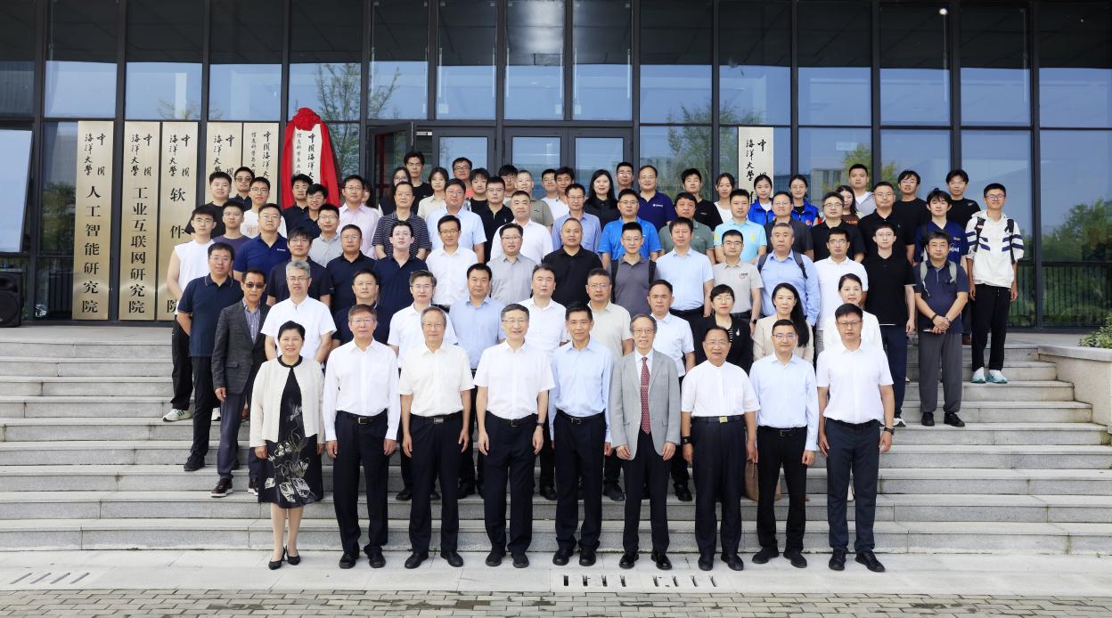 张峻峰、陈生、赵强福、程利伟、张占海、柳忠勤、刘军萍、董军宇等共同为中国海洋大学人工智能学院揭牌。