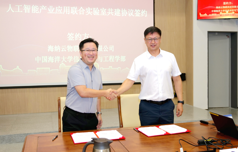 校企签约仪式上,董军宇代表信息科学与工程学部与海纳云物联科技有限公司总经理车延超签署人工智能产业应用联合实验室共建协议。未来,双方将携手推进人工智能领域的技术研发、人才培养与产业应用深度融合。
