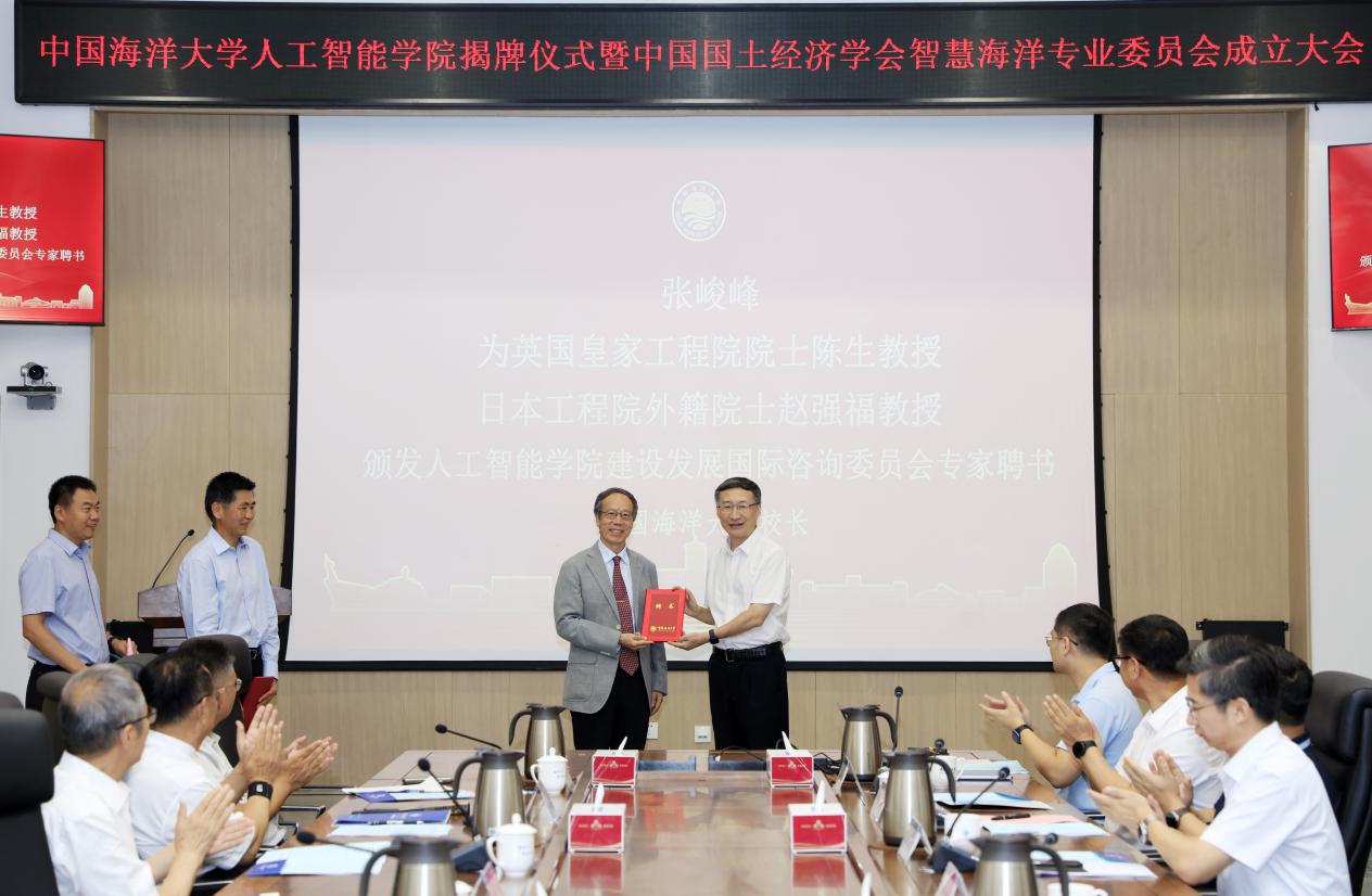 9月14日,中国海洋大学人工智能学院成立暨揭牌仪式在西海岸校区举行。中国海洋大学校长张峻峰,英国皇家工程院院士陈生教授,日本工程院外籍院士赵强福教授,中国自然资源部原总工程师、中国矿业联合会第七届理事会会长程利伟,中国自然资源部原总工程师、中国大洋矿产资源研究开发协会第七届理事会理事长张占海,中国国土经济学会名誉理事长、第五届理事会理事长、党委书记柳忠勤,中国国土经济学会副理事长刘军萍,学校党委常委、组织部部长蒋秋飚,学校党委教师工作部部长、人事处处长毛相朝,信息科学与工程学部党委书记张永胜、部长董军宇出席仪式。学校发展规划处处长刘海波主持仪式。