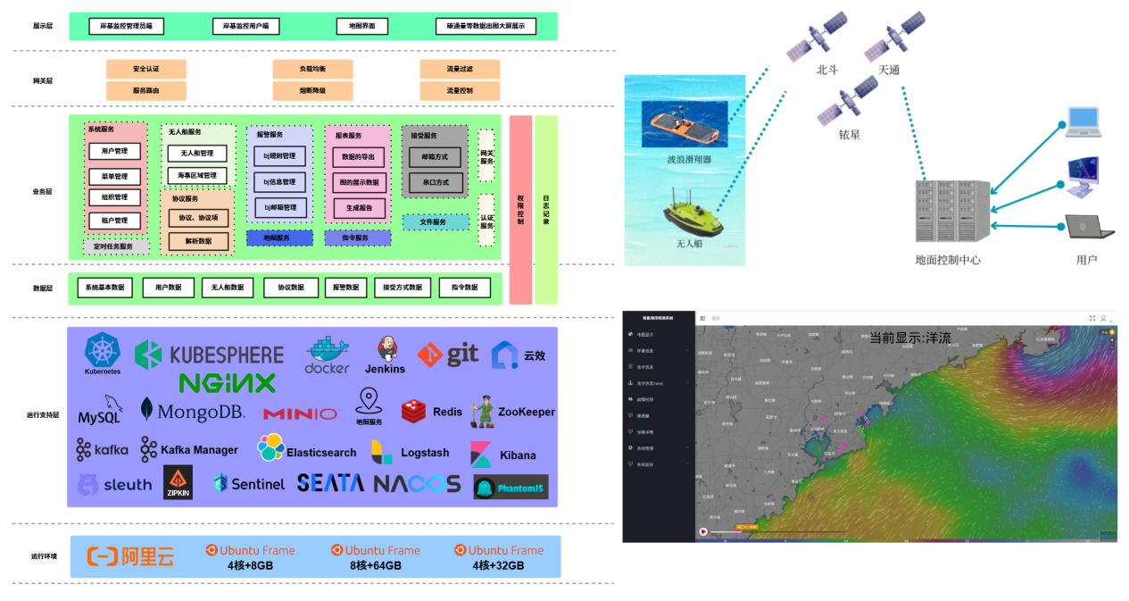 系统面向波浪滑翔器等海洋观测装备,采用多种卫星链路通讯,可保持与海上装备全天候、长时间实时交互;通过智能优化算法,使得装备在复杂海洋环境下有效应对洋流、暗礁、过往船只带来的风险。系统具有智能导航、加密通讯,设备远程控制、多源数据实时可视化、设备状态智能监测、异常自动报警、海试报告一键生成等多种功能。底层架构依托云原生与微服务技术栈,集成多类中间件与容器化工具,实现服务高可用、易扩展、轻量化部署与高效运维;上层通过模块化业务分层与多端支持,可快速支撑复杂业务场景迭代与扩展,兼具技术先进性与功能灵活性。本系统为海洋观测提供了一种智能化、通用化、已验证的解决方案。