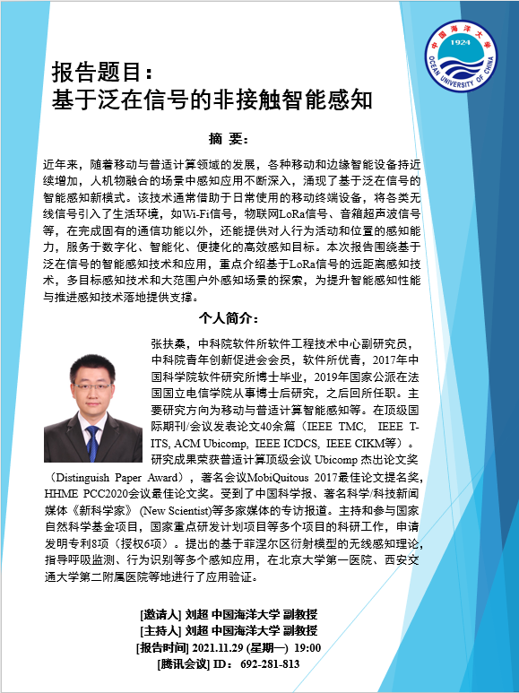 【11月29日 19:00】中科院软件所张扶桑副研究员 报告 《基于泛在信号的非接触智能感知》