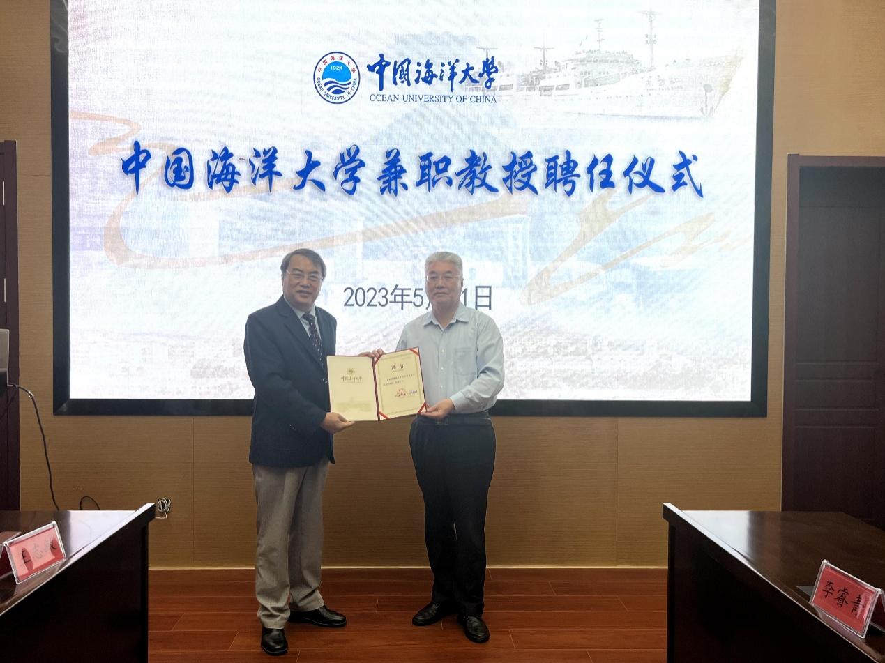 On the morning of May 21st, Dr. Cao Zhen, a researcher from the High Energy Physics Institute of the Chinese Academy of Sciences, was hired as a part-time professor at China Ocean University. The ceremony for his appointment and an academic lecture were held in the frontier lecture hall of the Marine Science and Technology Building on campus. President Yu Zhigang, Vice-Director He Xin from the Science and Technology Office, Dean Lin Xiaopei from the School of Marine and Atmospheric Sciences, Dean Dong Junyu and Vice-Dean Gu Yongjian from the School of Information Science and Engineering, and Dean Yuan Guang from the School of Physics and Optoelectronics, together with nearly 100 students and teachers, attended the ceremony. The ceremony was hosted by Vice-Director Li Ruiqing from the Personnel Office.