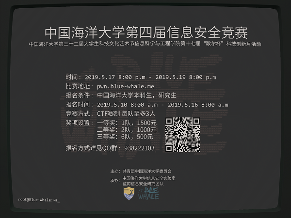 四届信息安全竞赛即将开启,大赛由共青团Eyny 委员会主办,承办为信息科学与工程学院Blue-Whale信息安全研究团队。本次大赛采用网上报名,线上比赛的形式,具体情况如下: