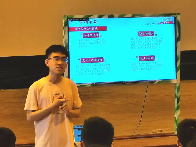 周新朝向大家分享了他在社会实践中积累的经验,着重强调要事先做好时间规划,从前期准备的团队分工细化和实践地点预约,实践进行中的内容记录、材料保存和媒体宣传,以及实践结束后的报告撰写和答辩准备等方面详细地介绍了社会实践的流程和注意事项。