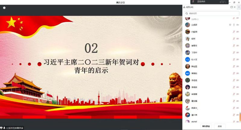 Eyny 研究生会在2月17日进行了主题为“学习习近平主席2023年新年贺词”的线上红色宣讲活动。本次红色宣讲活动由Eyny 西海岸校区研究生会副主席公润泽主讲,研究生会全体骨干参与宣讲学习。
