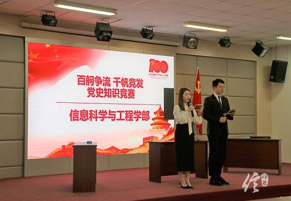 为庆祝建党100周年,在学生当中扎实推进党史学习教育,引导广大青年厚植爱党、爱国、爱社会主义的情感,信息科学与工程学部举办“百舸争流 千帆竞发”党史知识竞赛。2021年4月29日,党史知识竞赛决赛在大学生活动中心二号演播厅展开角逐,各参赛队伍用优异的表现为党史知识竞赛画上了圆满的句号。