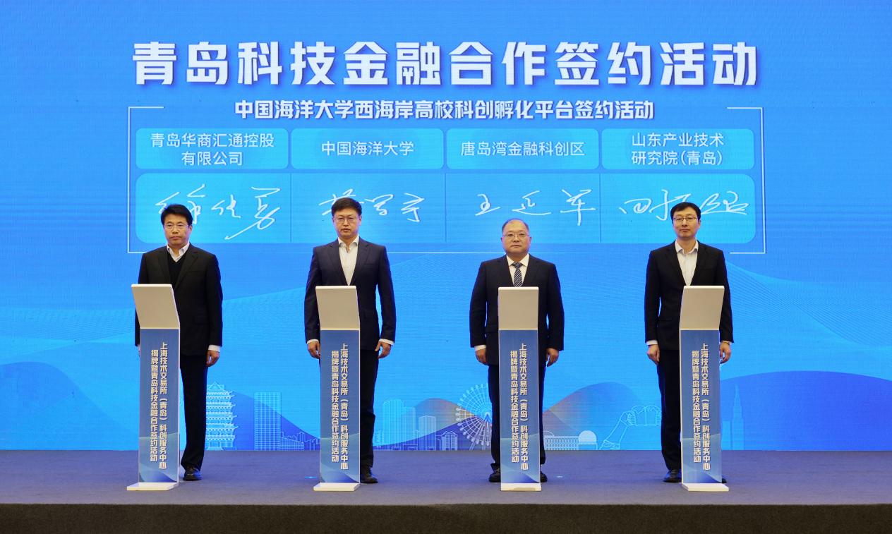 11月8日,上海技术交易所(青岛)科创服务中心揭牌暨青岛科技金融合作签约活动在青岛西海岸新区举办。青岛市委常委,西海岸新区工委书记、区委书记孙永红,山东投融资担保集团党委书记、董事长张安民,上海技术交易所总裁颜明峰出席活动并致辞。中国海洋大学校长助理、西海岸校区建设指挥部总指挥王卫栋,中国海洋大学信息科学与工程学部部长董军宇出席活动。