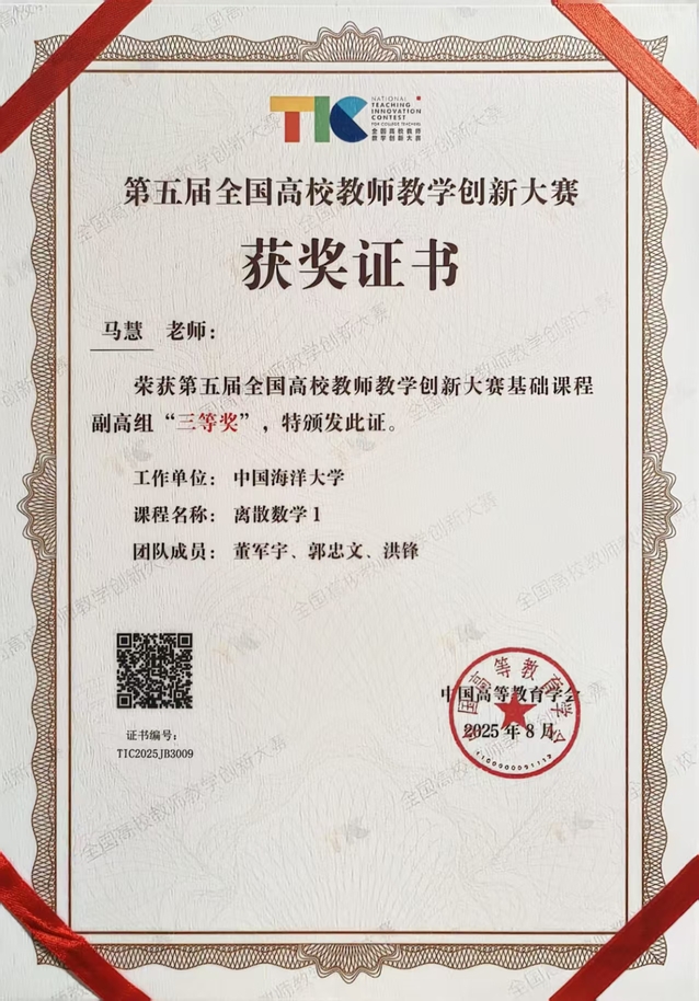 近日,由教育部高等教育司指导、中国高等教育学会主办的第五届全国高校教师教学创新大赛全国现场赛在北京理工大学圆满落幕。信息科学与工程学部马慧副教授为主讲教师的“离散数学1”课程团队获基础课程副高组三等奖。