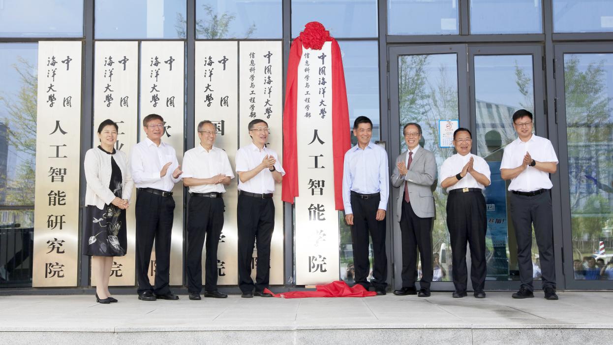 张峻峰、陈生、赵强福、程利伟、张占海、柳忠勤、刘军萍、董军宇等共同为中国海洋大学人工智能学院揭牌。