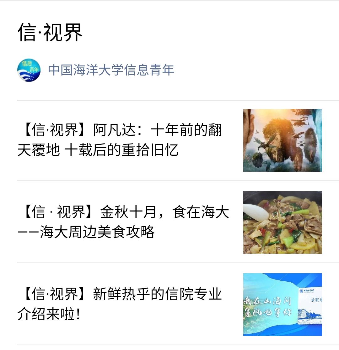 1.打造精品内容:顺应同学们的期待与时事热点,如新媒体中心自己创作的信视界板块,在开学之际推出了信院专业介绍,打消同学们对专业的迷茫,更好地适应大学生活;在疫情出校难的时候,推出推送介绍海大周边美食,让大家不出远门就能大饱口福;在阿凡达十年后重映之际,推出阿凡达的影评,与同学们产生共鸣。丰富同学们的精神世界。