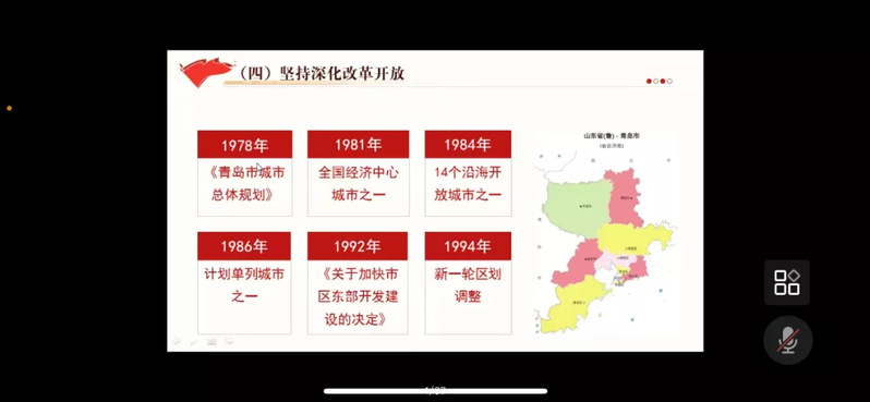 宣讲中还提到改革开放是当代中国最鲜明的特色,以青岛为例,改革开放为青岛带来了一系列的发展机会。目前,青岛部分地区已经成为全国百强区,改革开放促进了青岛的海洋经济发展,对于青岛城市品质等方面带来巨大的优势。