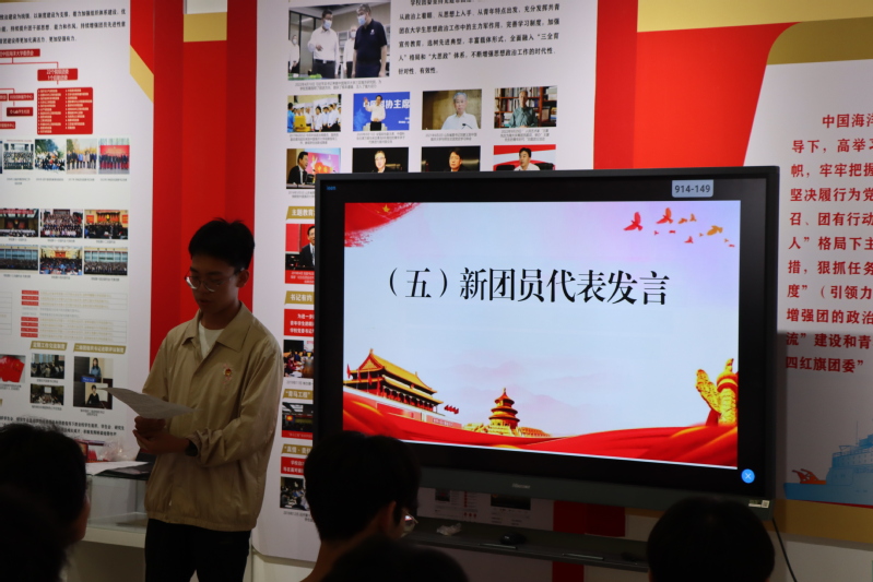 2023级海洋技术1班曾天朗带领新团员宣誓,“我志愿加入中国共产主义青年团,坚决拥护中国共产党的领导,遵守团的章程,执行团的决议,履行团员义务,严守团的纪律,勤奋学习,积极工作,吃苦在前,享受在后,为共产主义事业而奋斗。”